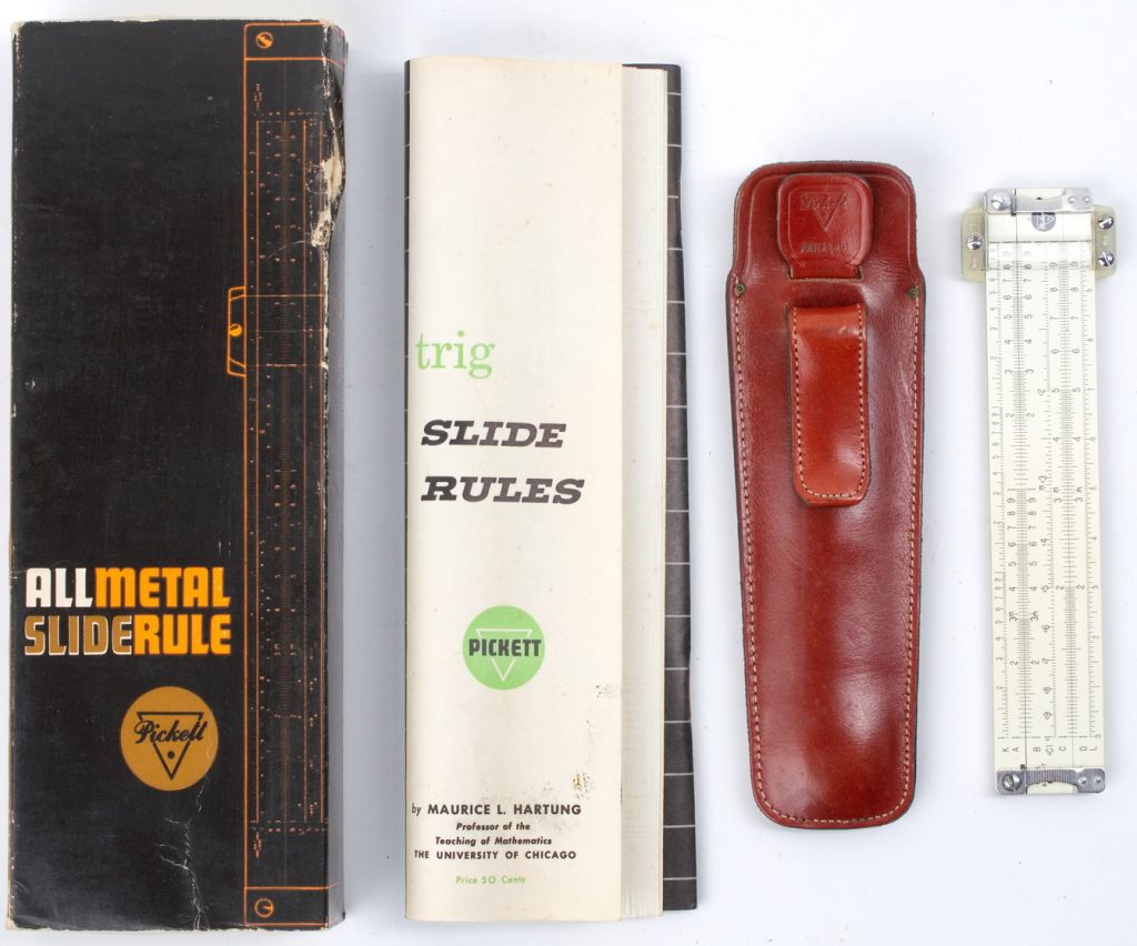 Pocket Duplex Rule, complete in factory box with embossed leather pocket case with nifty extractor tab to easily pull the rule out, and Pickett instruction manual.